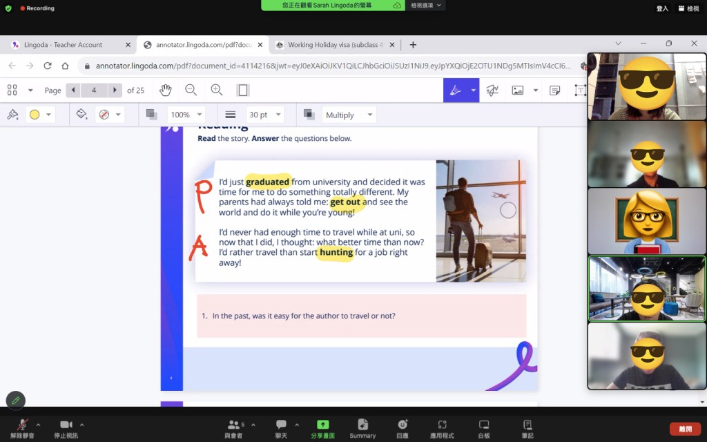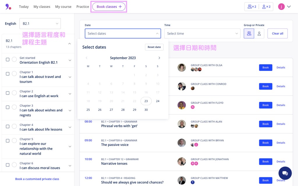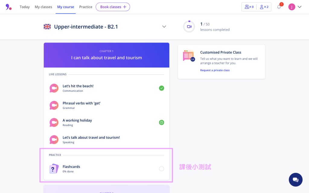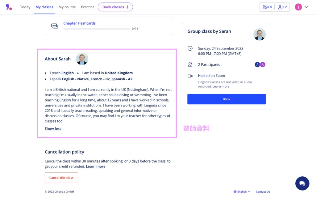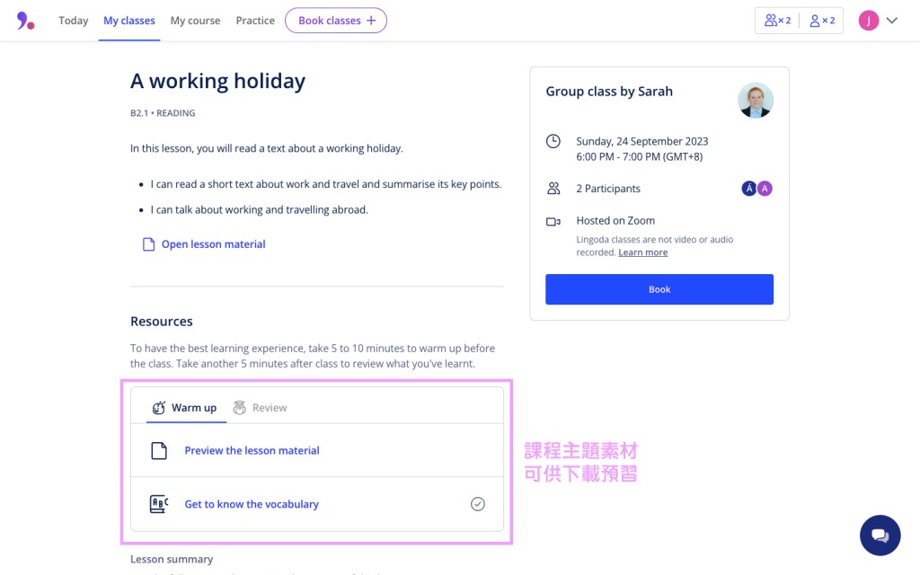 另外,Lingoda可選擇團體或私人課程,以最多5名學生組成的小組 / 1對1的私人課程學習,亦有很多不同主題的課程,大家可以按自己需要或興好選擇。例如我曾試過參加一些有關「旅遊」主題的課程學習英文,在過程中有很多機會要你開口說話和交流,老師都會馬上糾正,我覺得這樣又真的不錯呢!